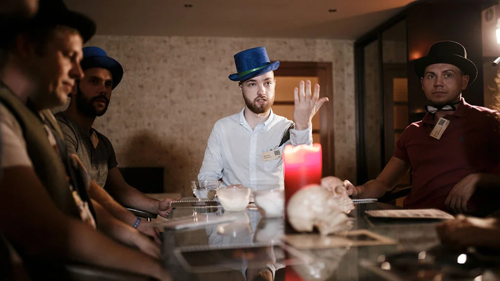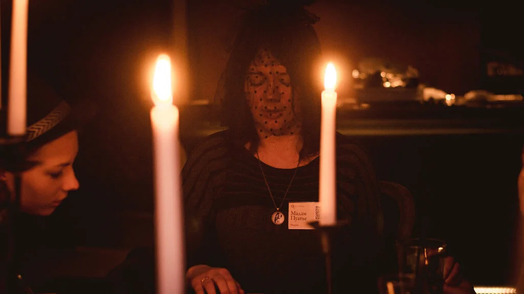 Ведущий создает атмосферу Викторианской Англии с помощью реквизита и музыки. Затем распределяет роли и объясняет правила игры. Вы с друзьями располагаетесь за столом, свет гаснет, загораются свечи. Медиум входит в транс. «Спиритический сеанс» начинается.
